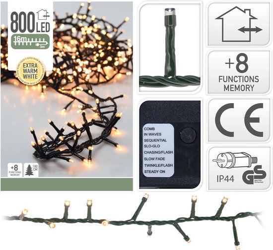 Deze lampjes kun je in je kerstboom hangen. Ze geven een warm, wit licht in de kerstboom. Het snoer is ongeveer 16 meter lang en er zitten wel 800 led lampjes op. Met een drukknopje kun je kiezen tussen 8 lichtstanden, waaronder: stilstaand, knipperend vlug, knipperend trager, etc. De afstand tussen de lampjes is 2 cm. Hiermee kun je met gemak een boom van 2 meter 40 versieren. Bij een boom kleiner dan 2 meter zul je draad overhouden. Je kunt de lampjes binnen en buiten gebruiken, dus je kunt ook een afdak of tuinhuisje ermee versieren.